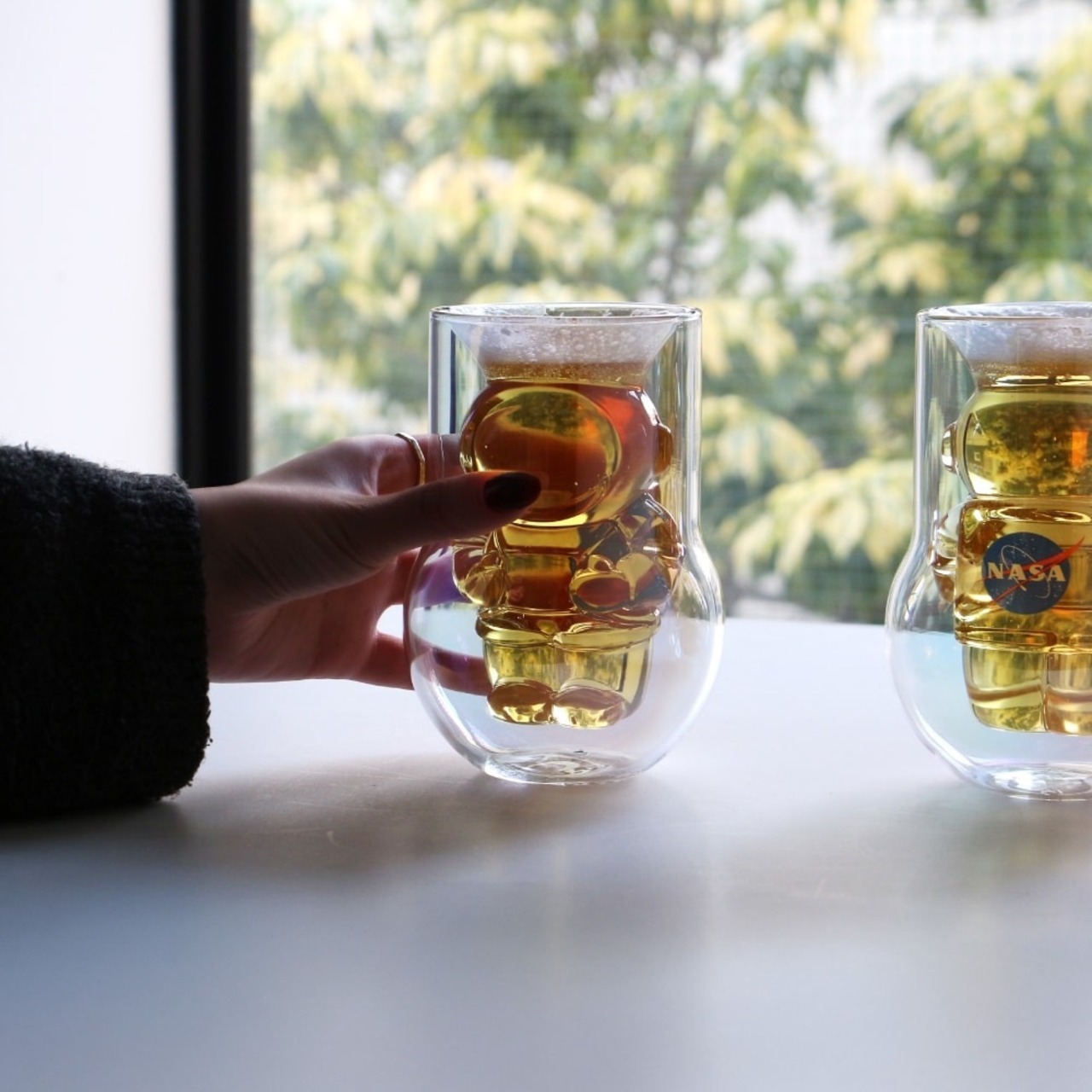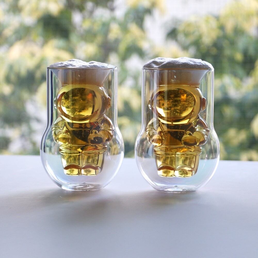 ドリンクを注ぐことで宇宙飛行士のシルエットが浮かび上がる、北カリフォルニアのDragon GlasswareとNASAとのコラボレーションのグラス2個セット。