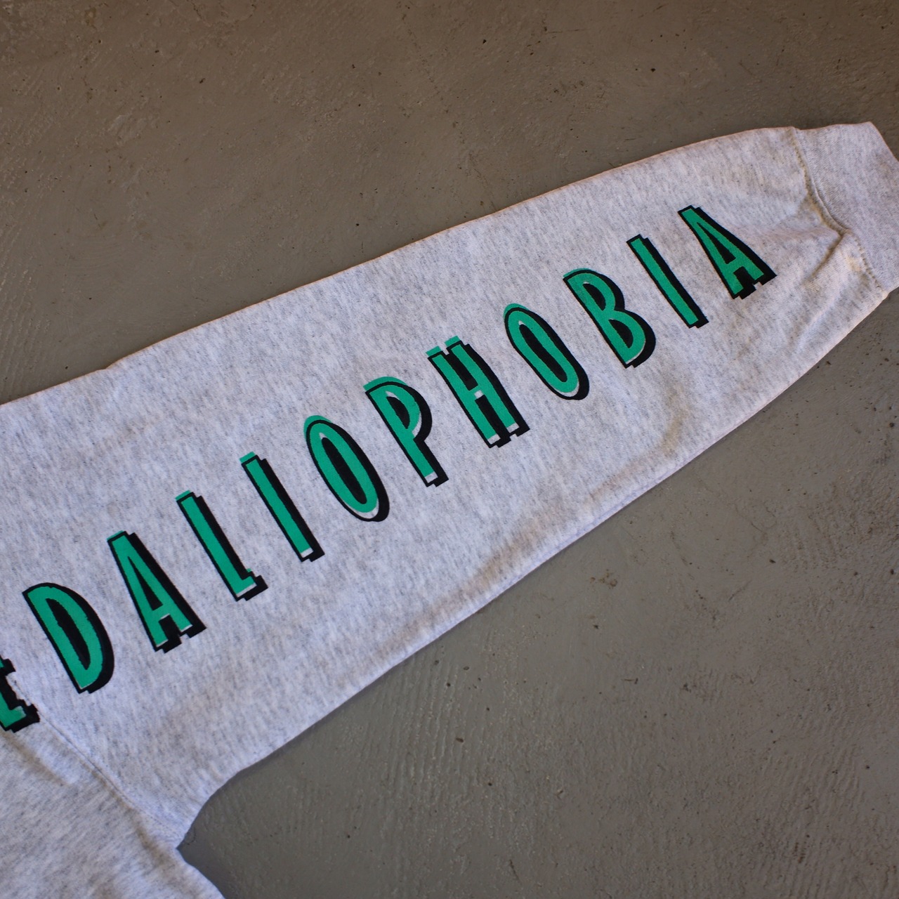 HIPPOPOTOMONSTROSESQUIPEDALIOPHOBIAと肩から両腕にプリントされたデザイン。