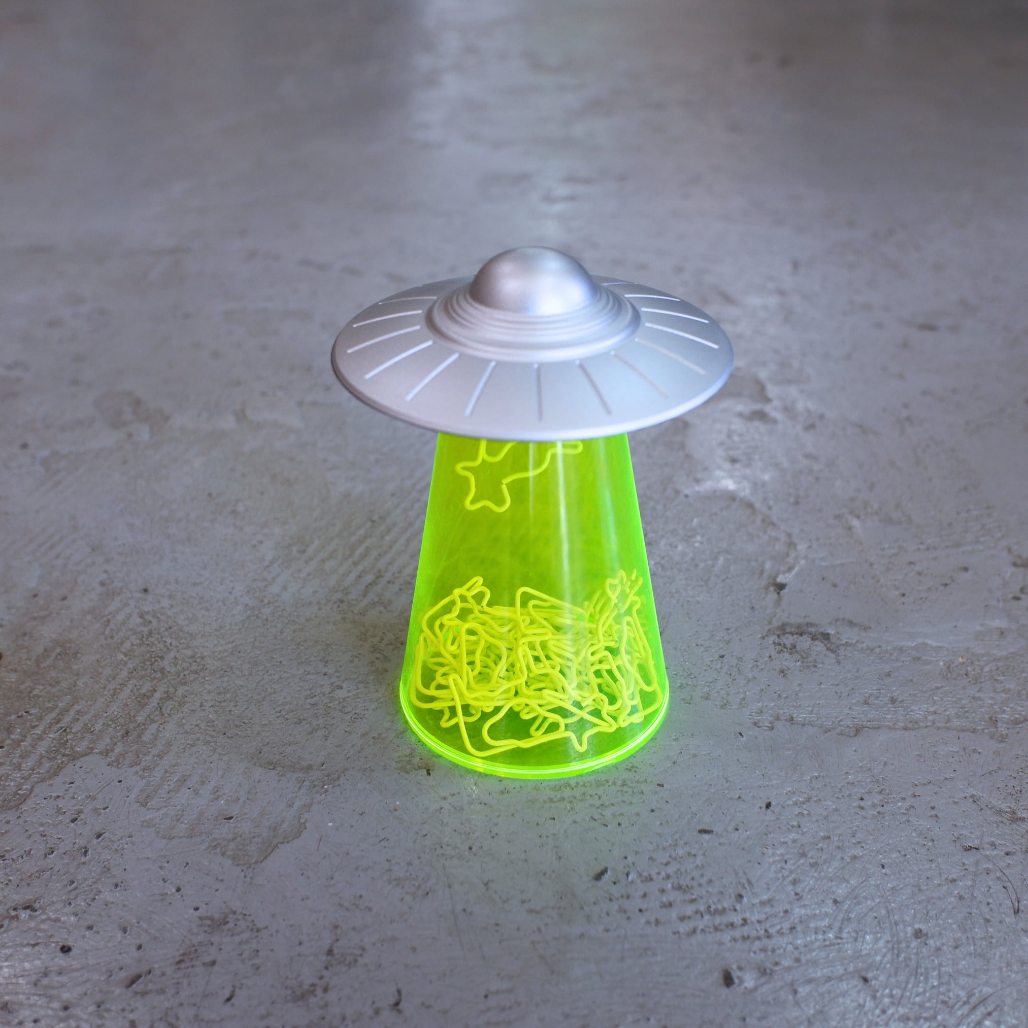怪しく光るネオンイエローのケースと、UFO型のマグネットホルダー。