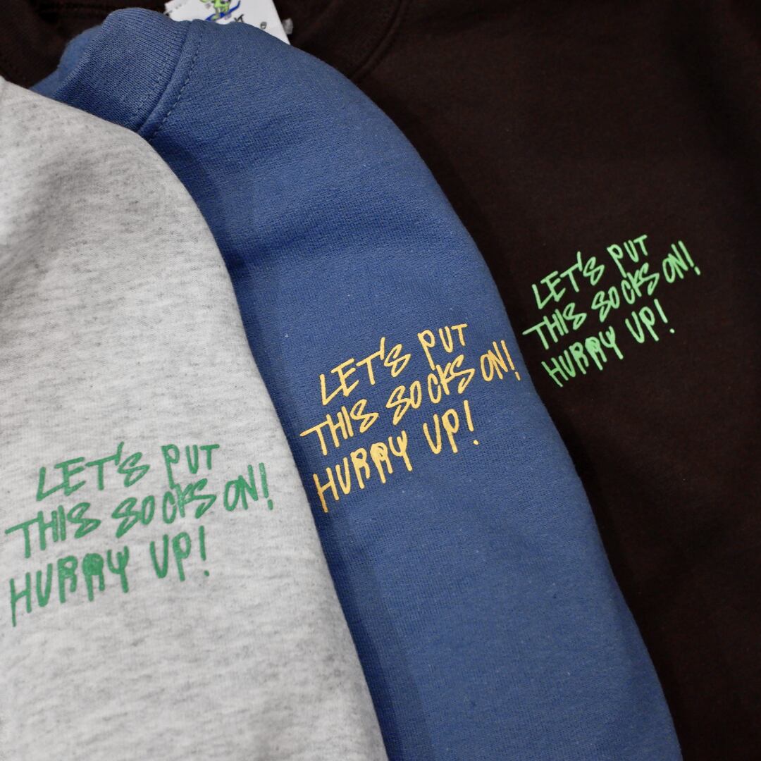 " LET'S PUT THIS SOCKS ON !HURRY UP !" をプリント。